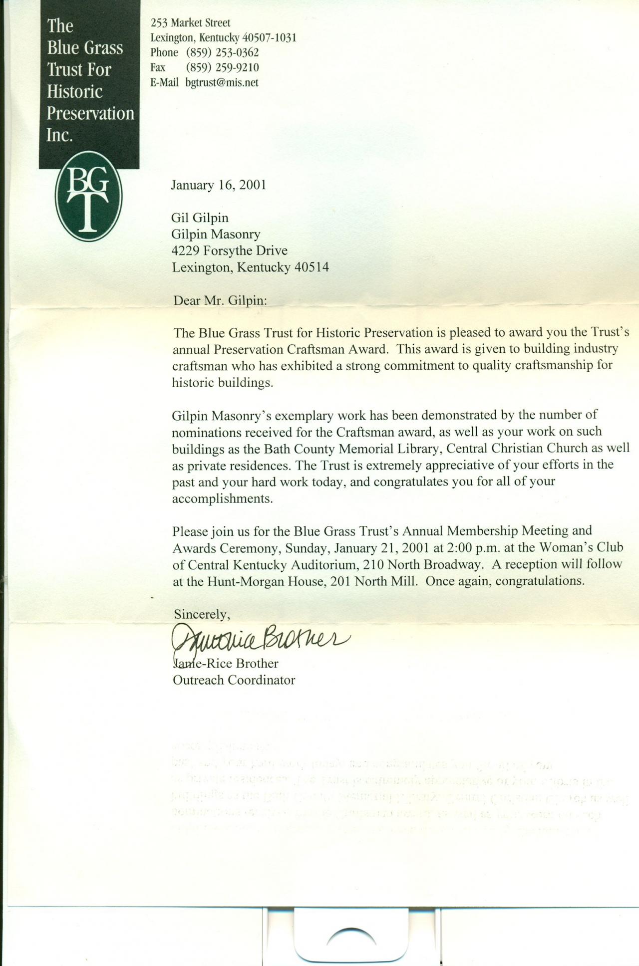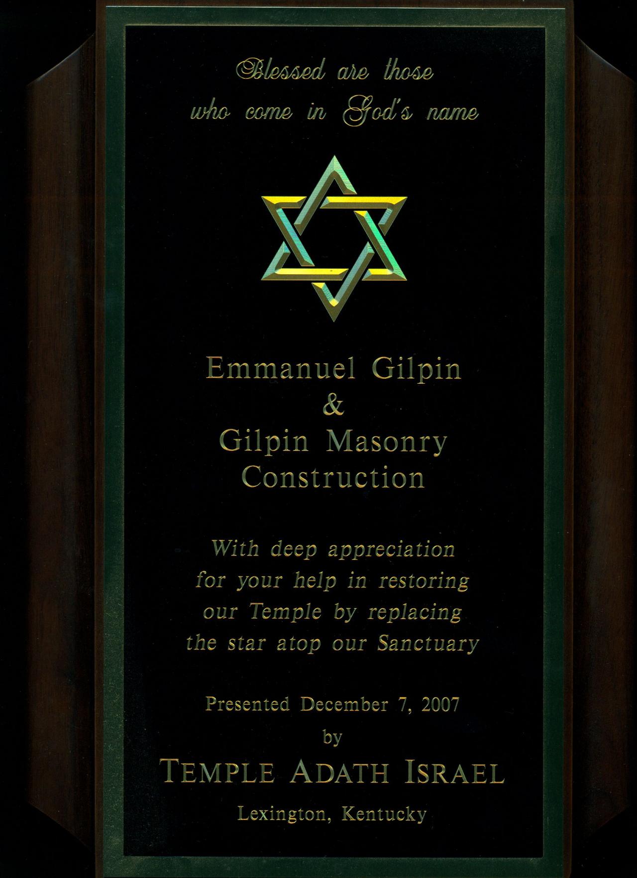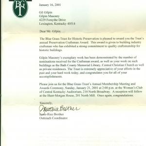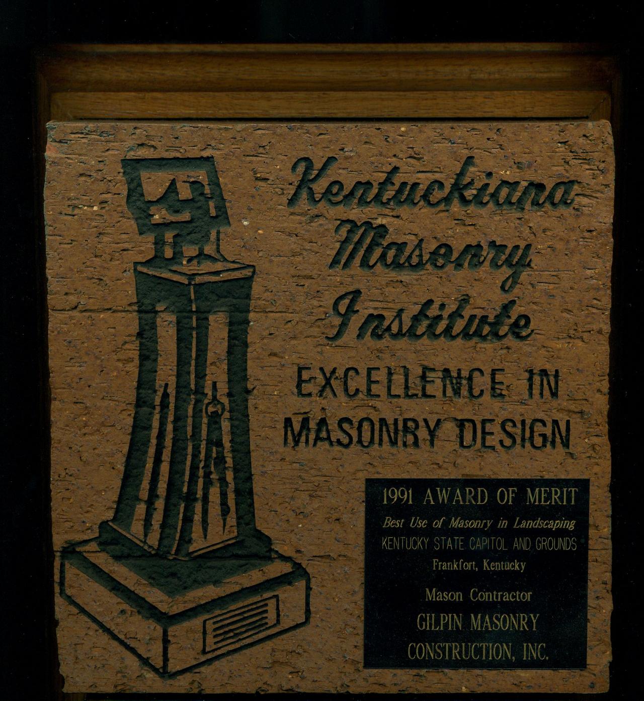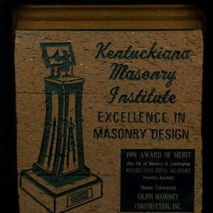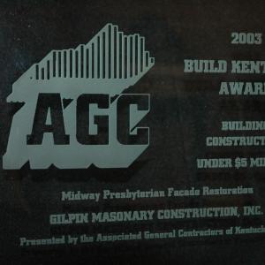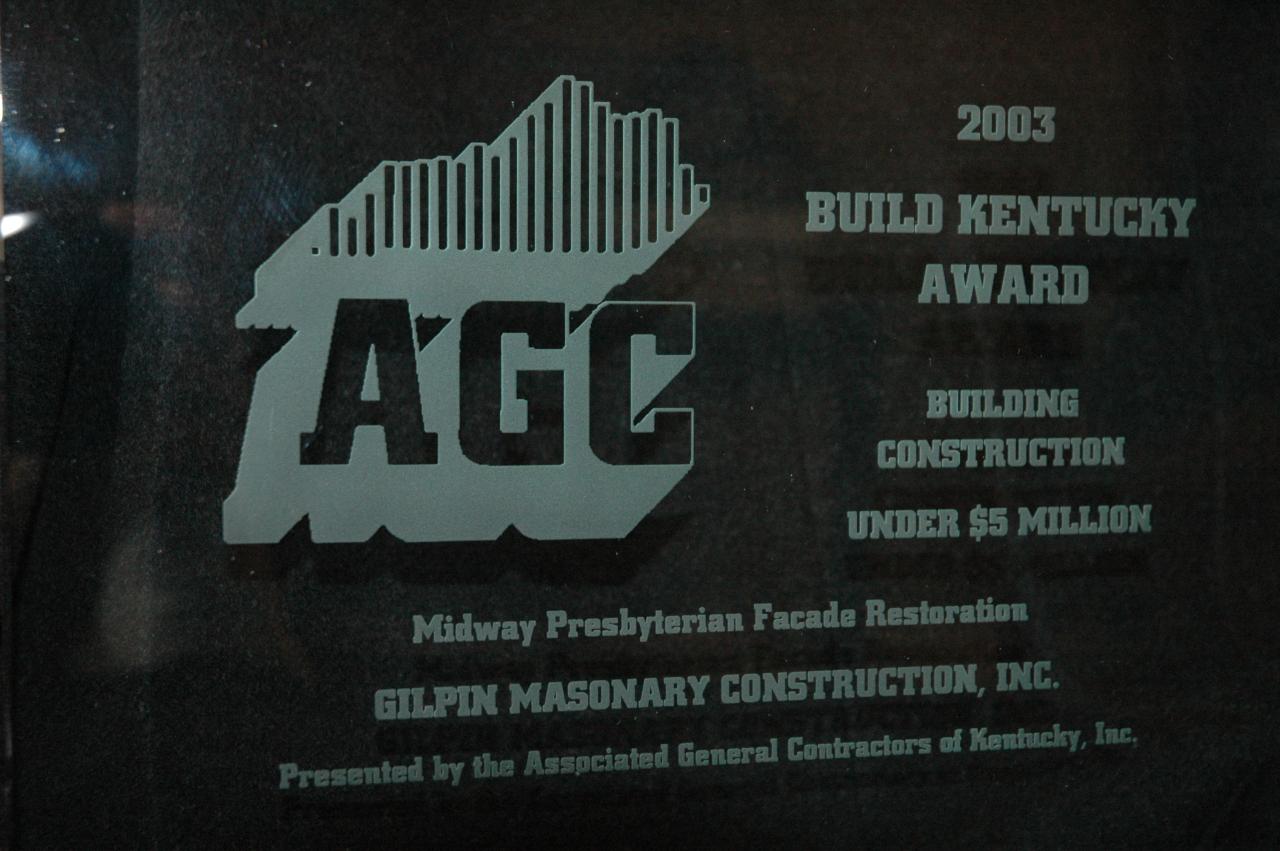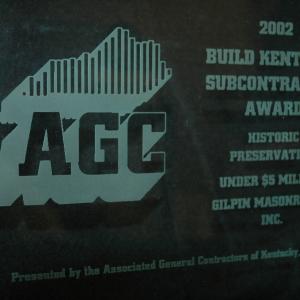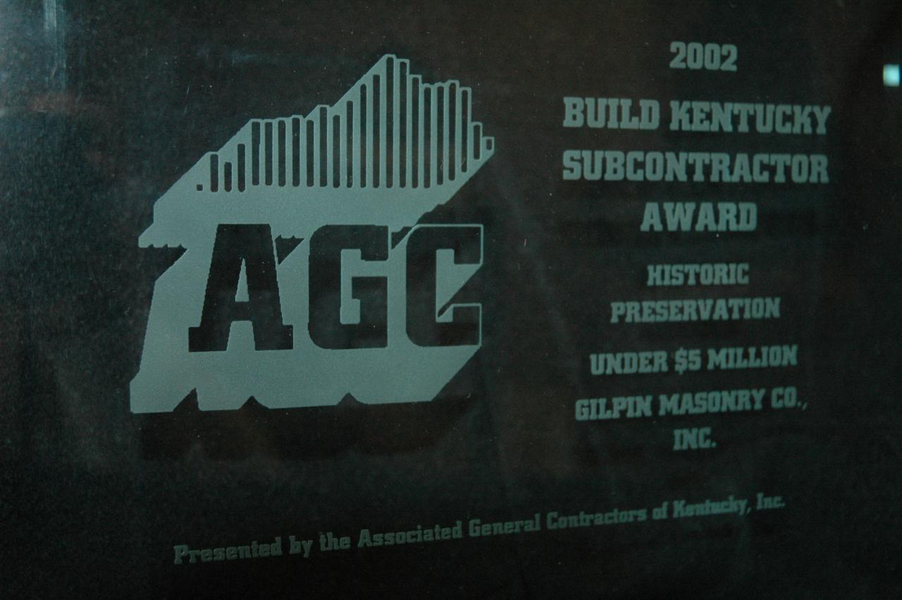 This award was given by the Associated General Contractors of Kentucky in the subcontractor division for Historic Preservation. The William Whitley Home is the oldest brick house in Kentucky and a state park for many years. We replaced all of the mortar joints on the exterior of the building.